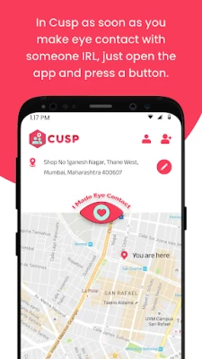 Everyone loves the feeling of excitement that comes with initial eye contact. Cusp offers the ability to embrace the immediacy of eye contact! How? It's simple. As soon as you make eye contact with someone in real life, just open the app and press a button. If the person you made eye contact with also presses that button, Cusp will show you their profile and them yours. Then you both hit "accept" and there's a match!
